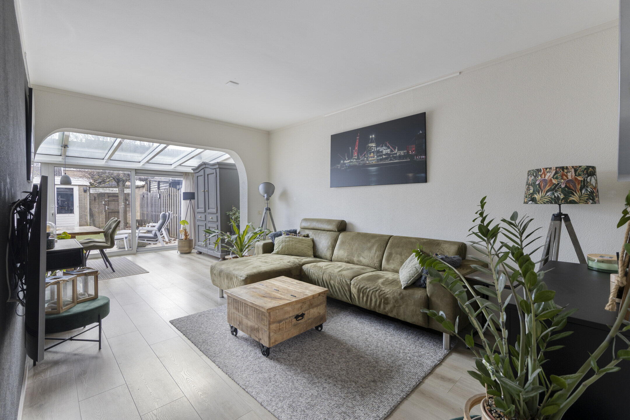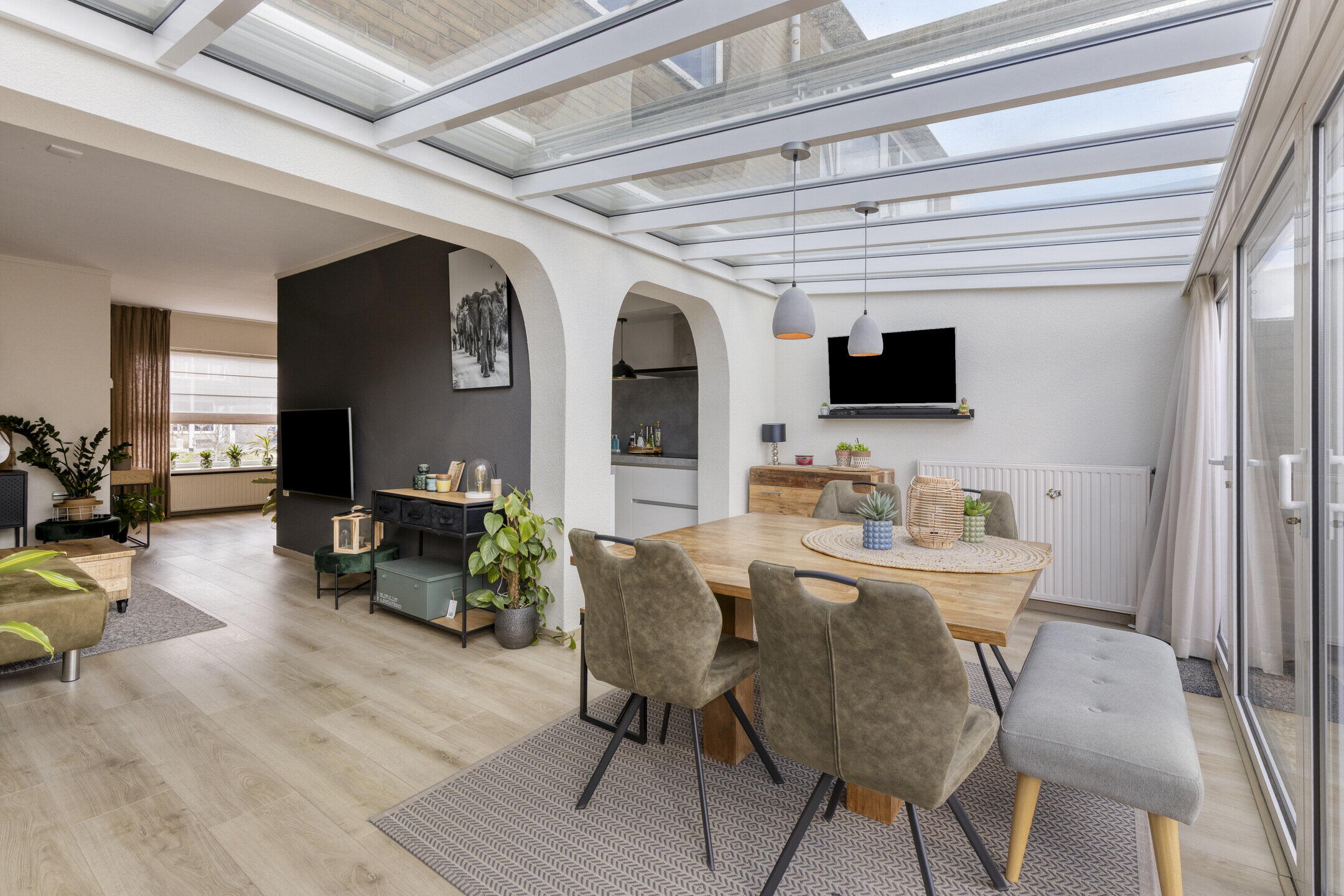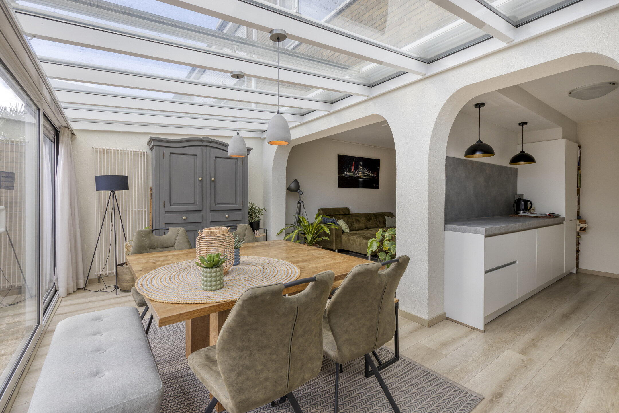 De woonkamer verrast meteen met zijn speelse indeling. Aan de voorzijde vind je een knusse zithoek, terwijl het middengedeelte ruimte biedt voor een grotere zithoek met tv. Aan de achterzijde word je getrakteerd op een prachtige serre met een royale eethoek. Wat een lichtinval! Dankzij de schuifpui vloeien binnen en buiten hier moeiteloos in elkaar over.