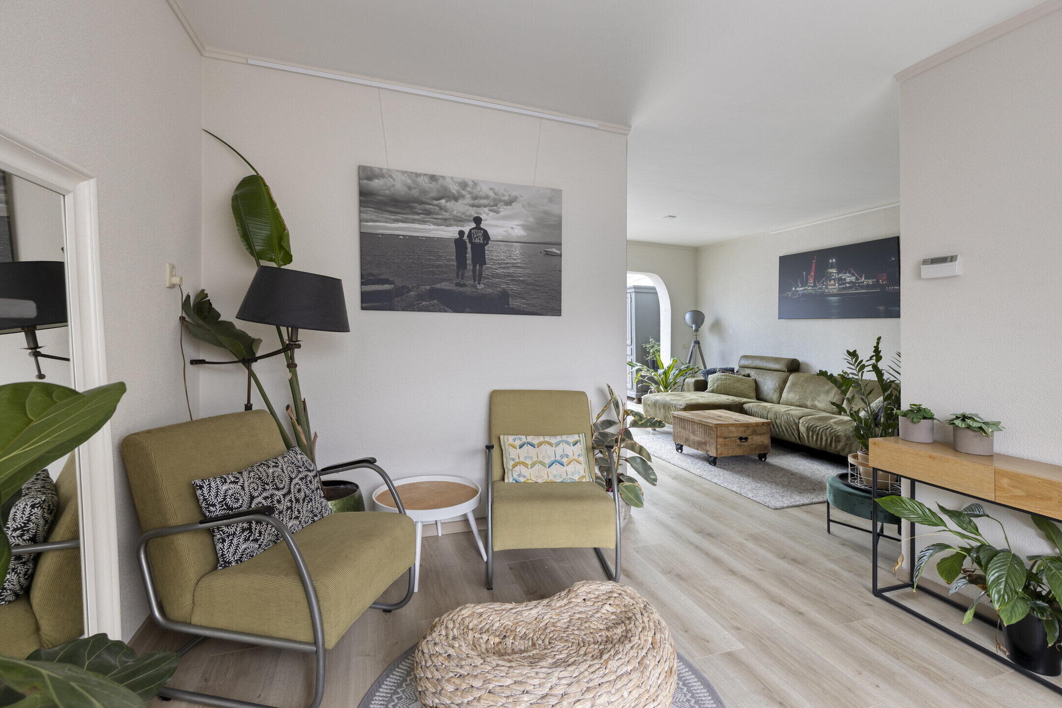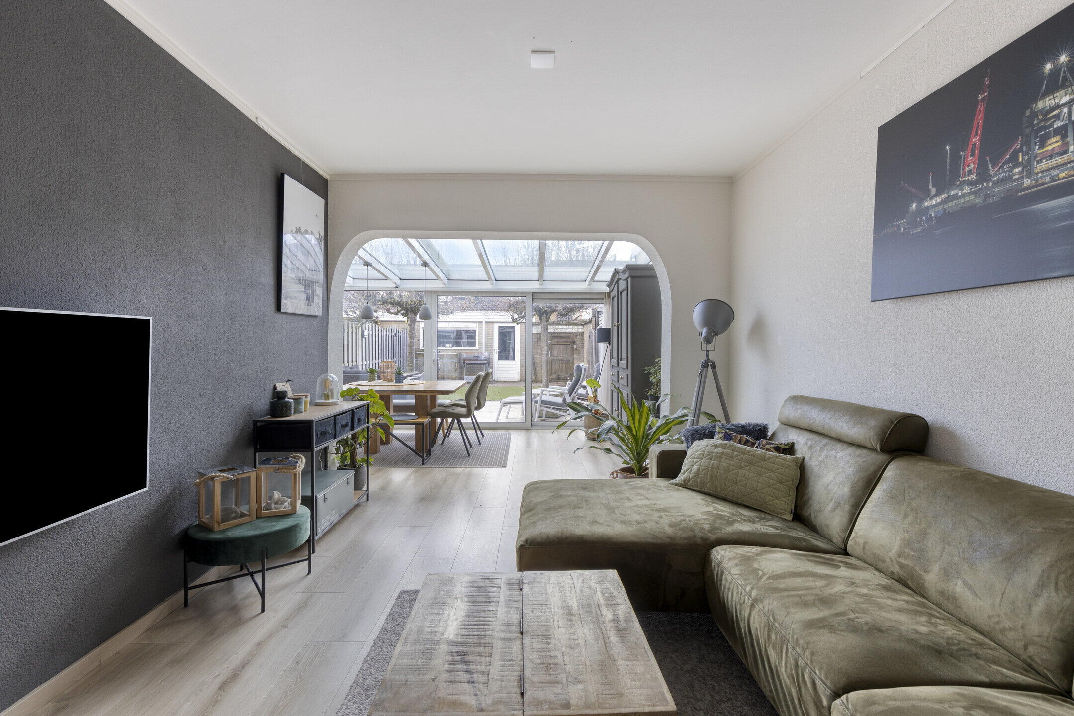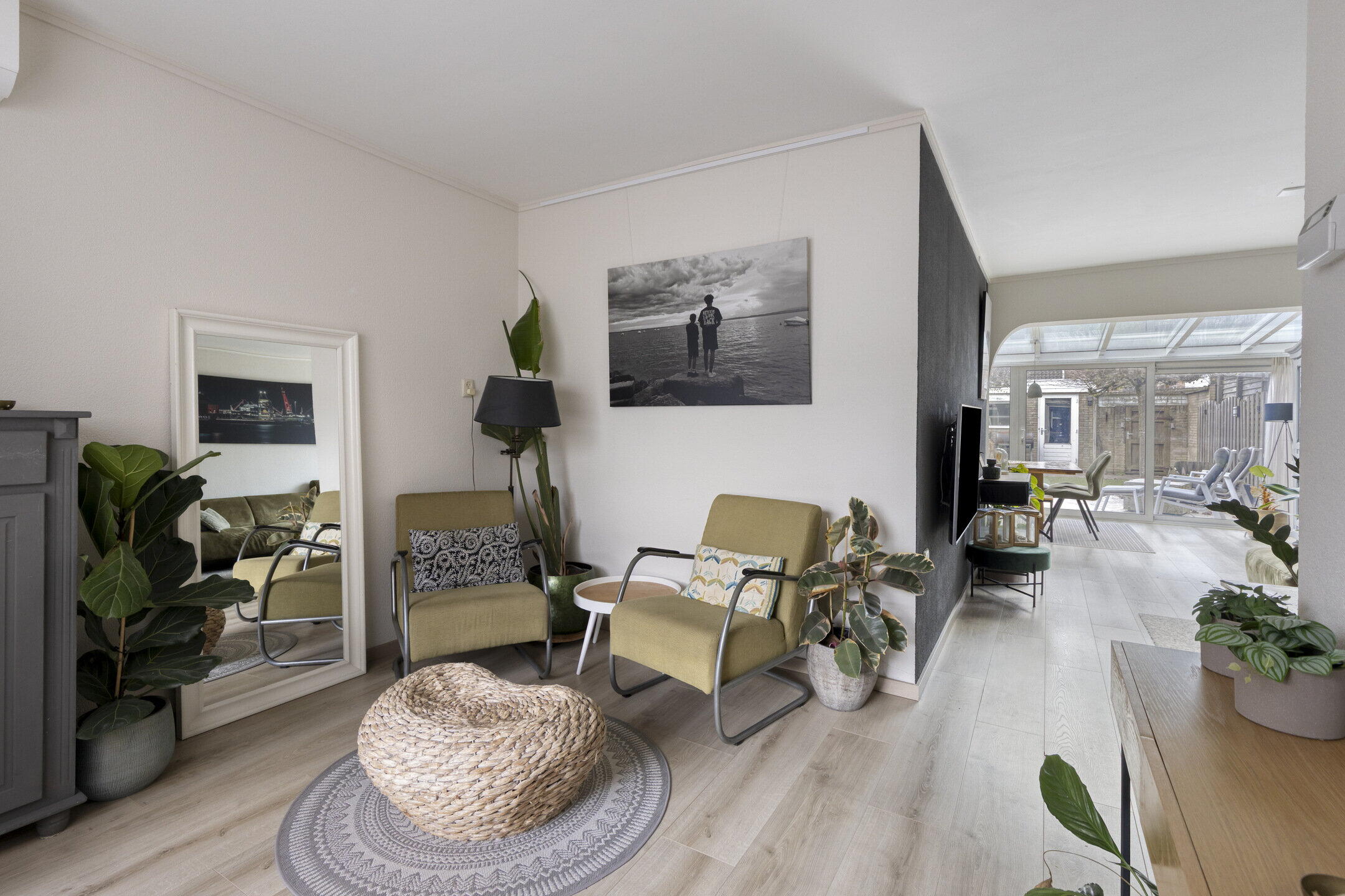 De woonkamer verrast meteen met zijn speelse indeling. Aan de voorzijde vind je een knusse zithoek, terwijl het middengedeelte ruimte biedt voor een grotere zithoek met tv. Aan de achterzijde word je getrakteerd op een prachtige serre met een royale eethoek. Wat een lichtinval! Dankzij de schuifpui vloeien binnen en buiten hier moeiteloos in elkaar over.
