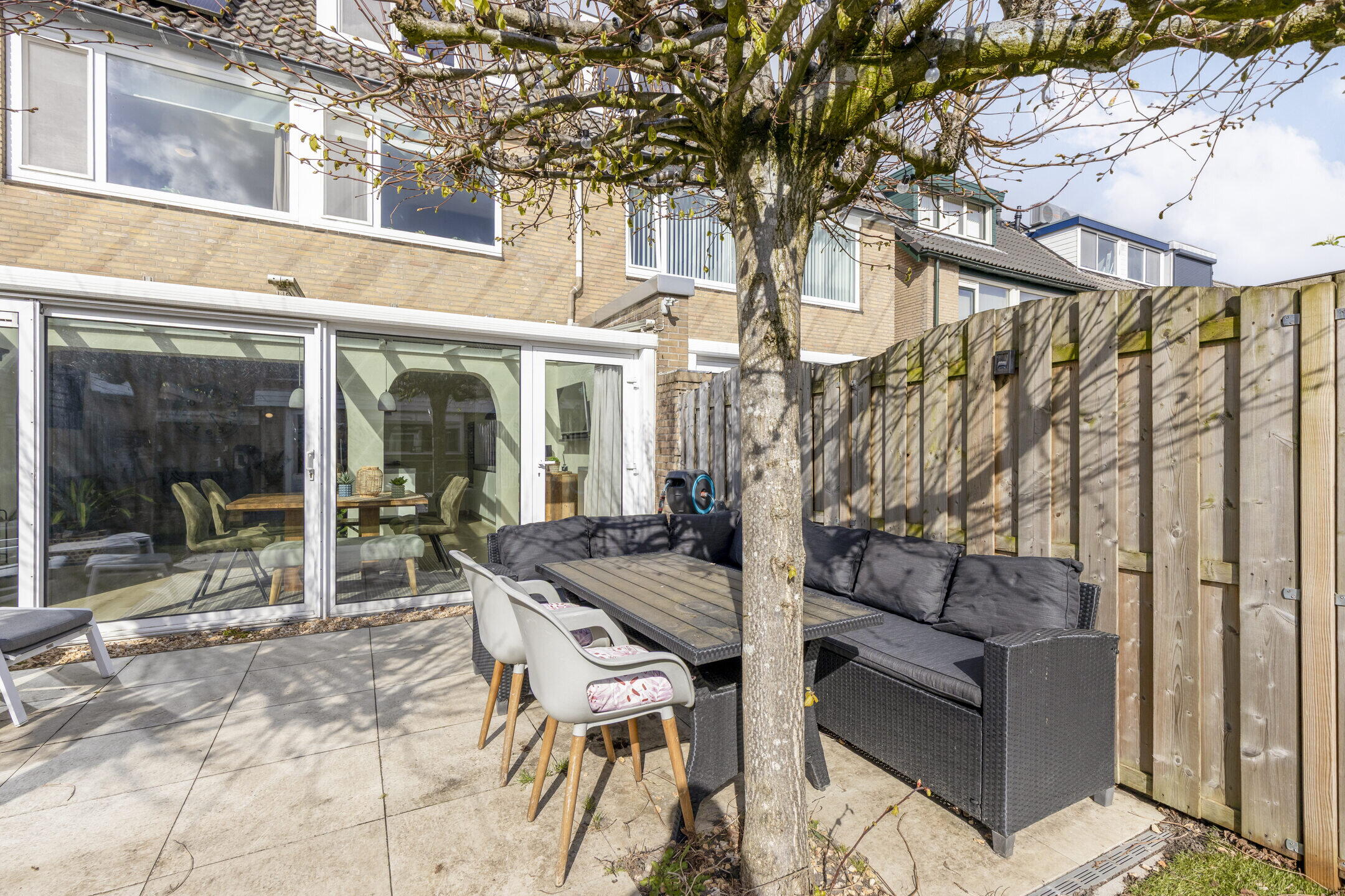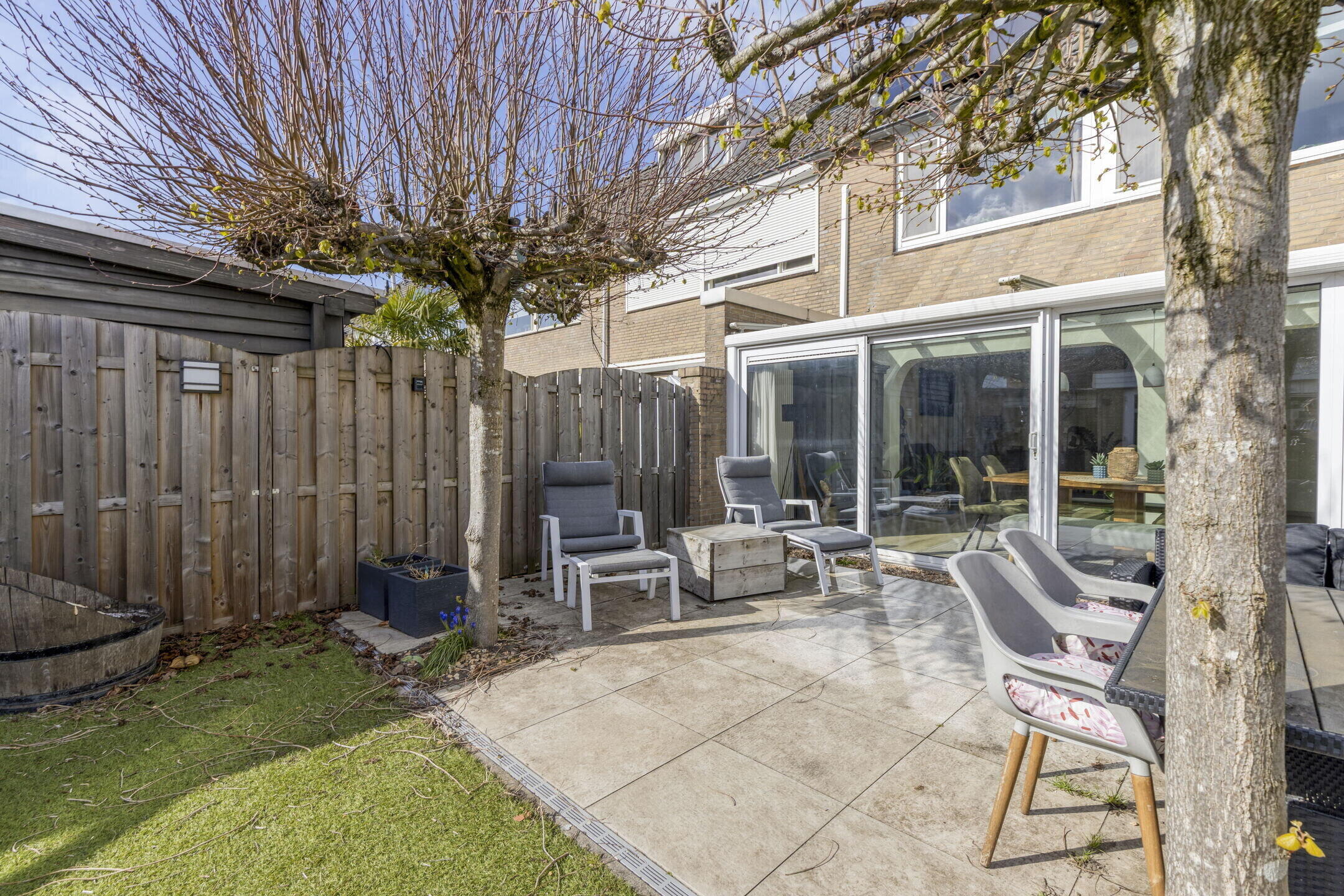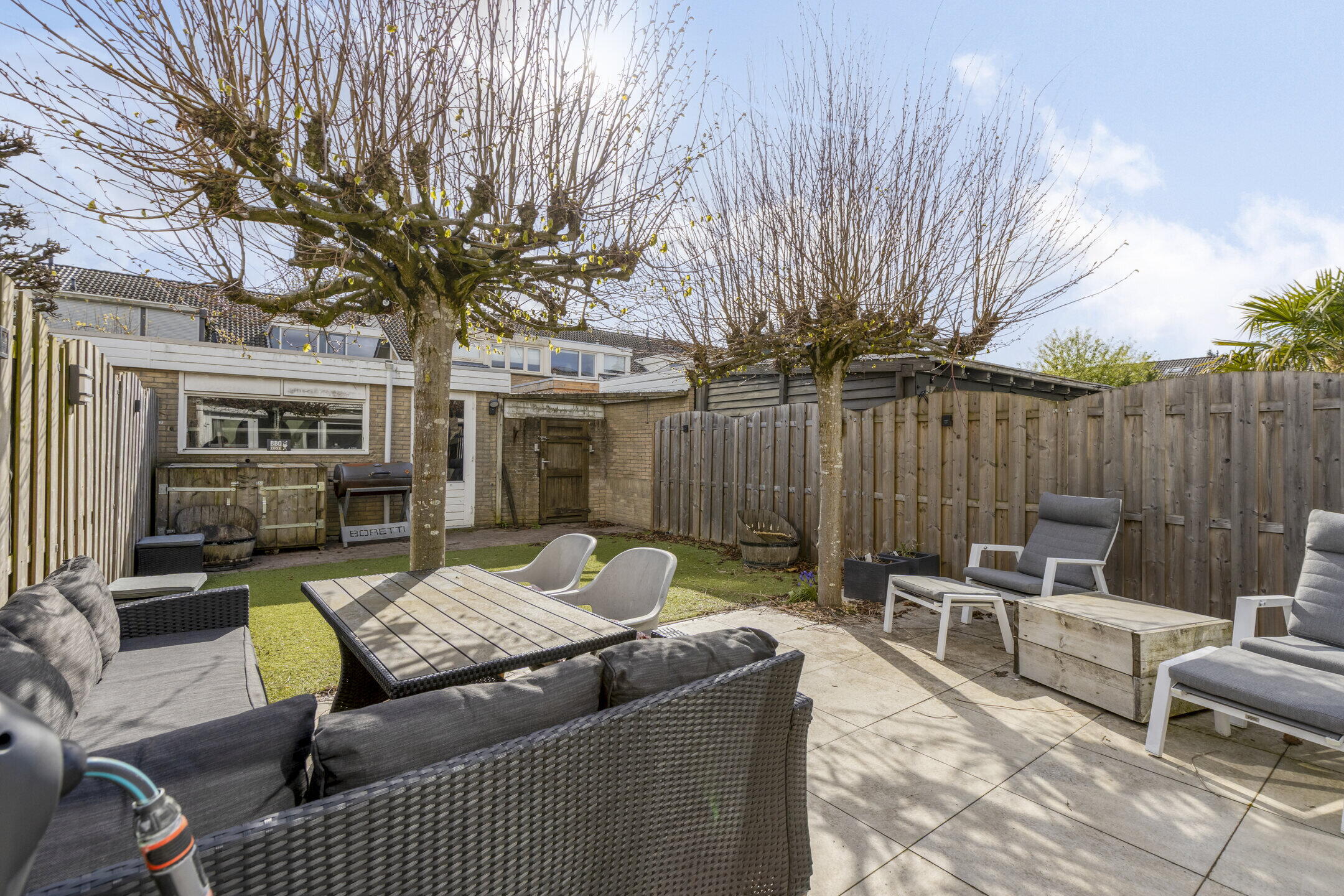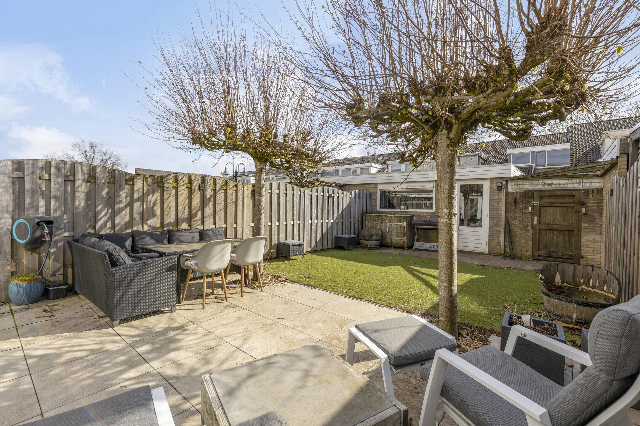 Vanuit de serre stap je zo de achtertuin in en wat een fijne plek is dit! De tuin is netjes aangelegd en biedt voldoende ruimte om te ontspannen. Achterin vind je een praktische schuur en een handige achterom. De twee grote platanen zorgen voor een prettige schaduwplek op warme dagen, waardoor je hier altijd comfortabel kunt genieten.
