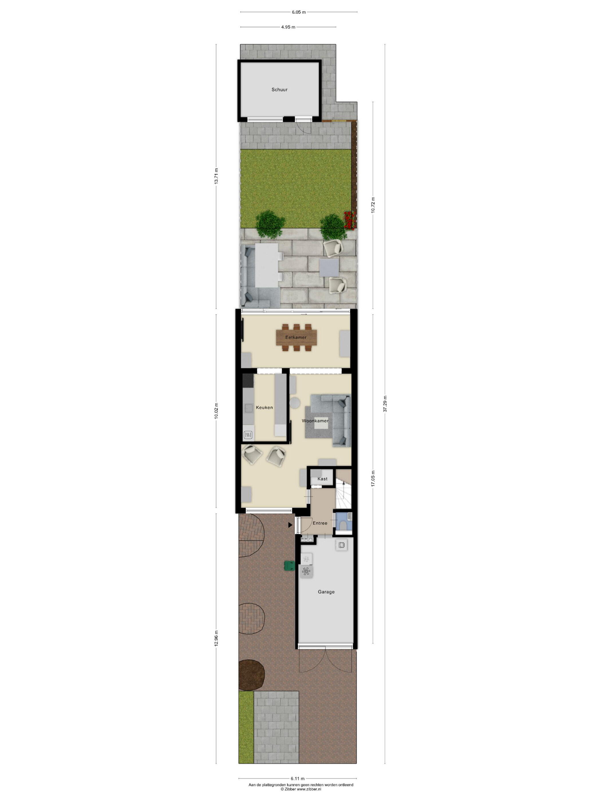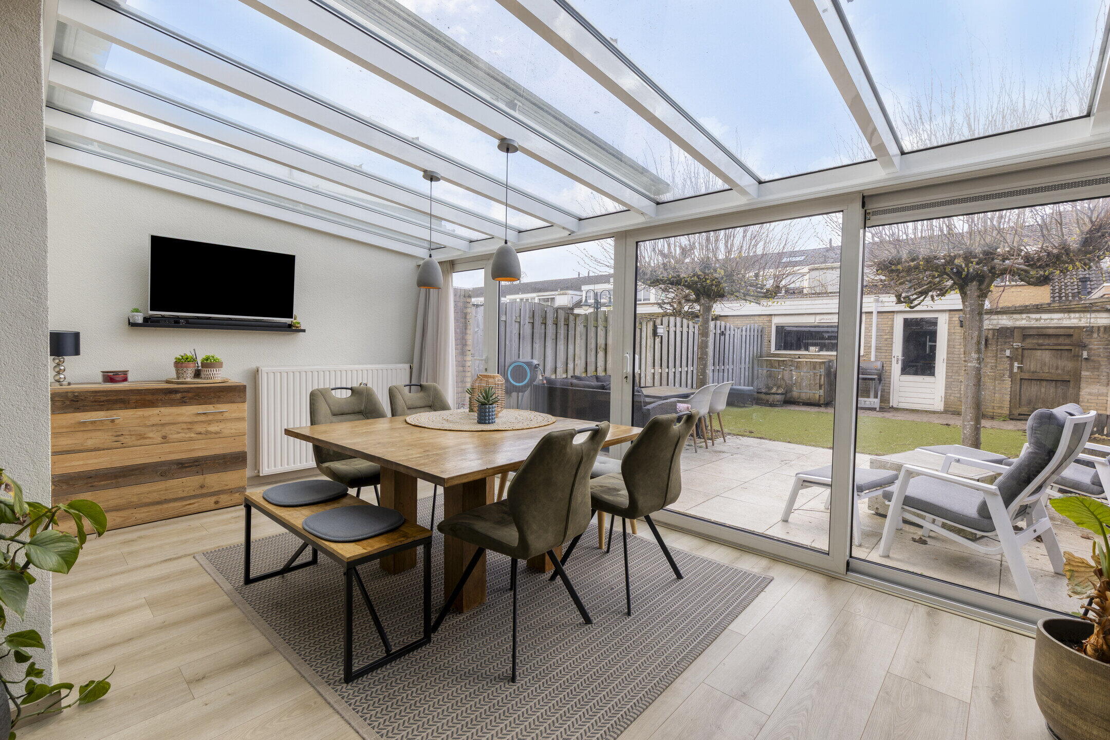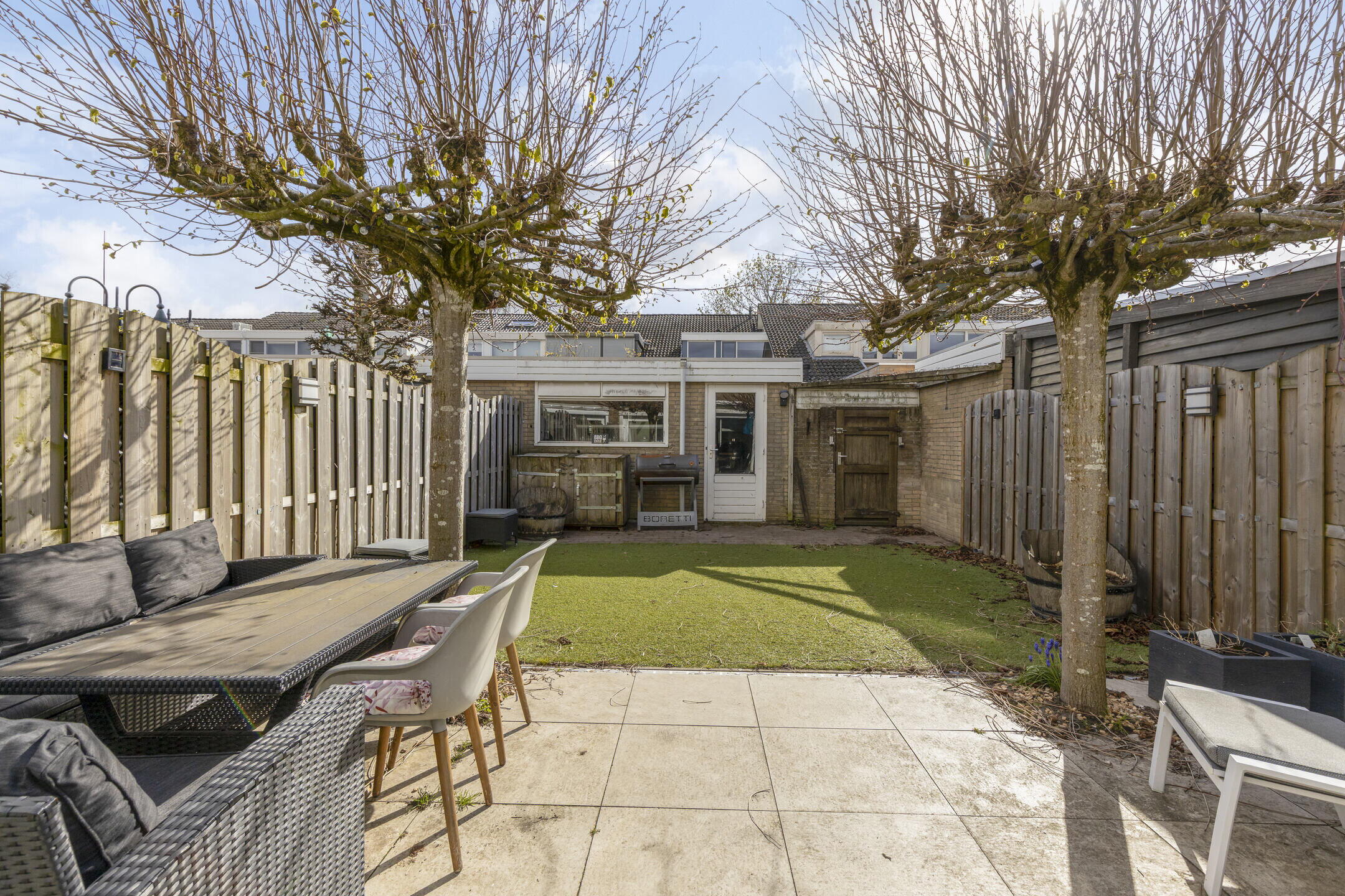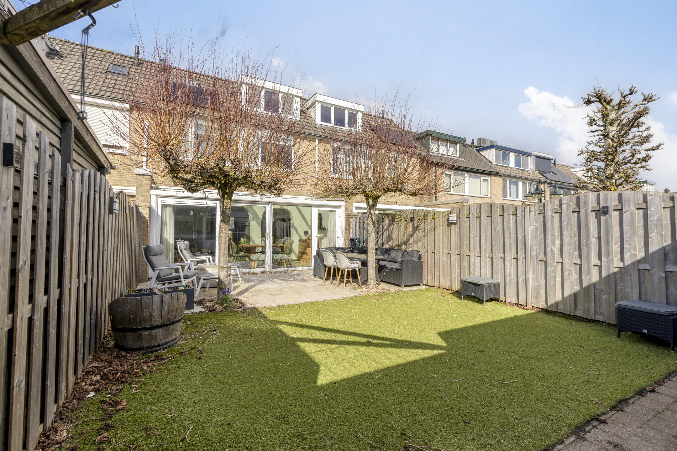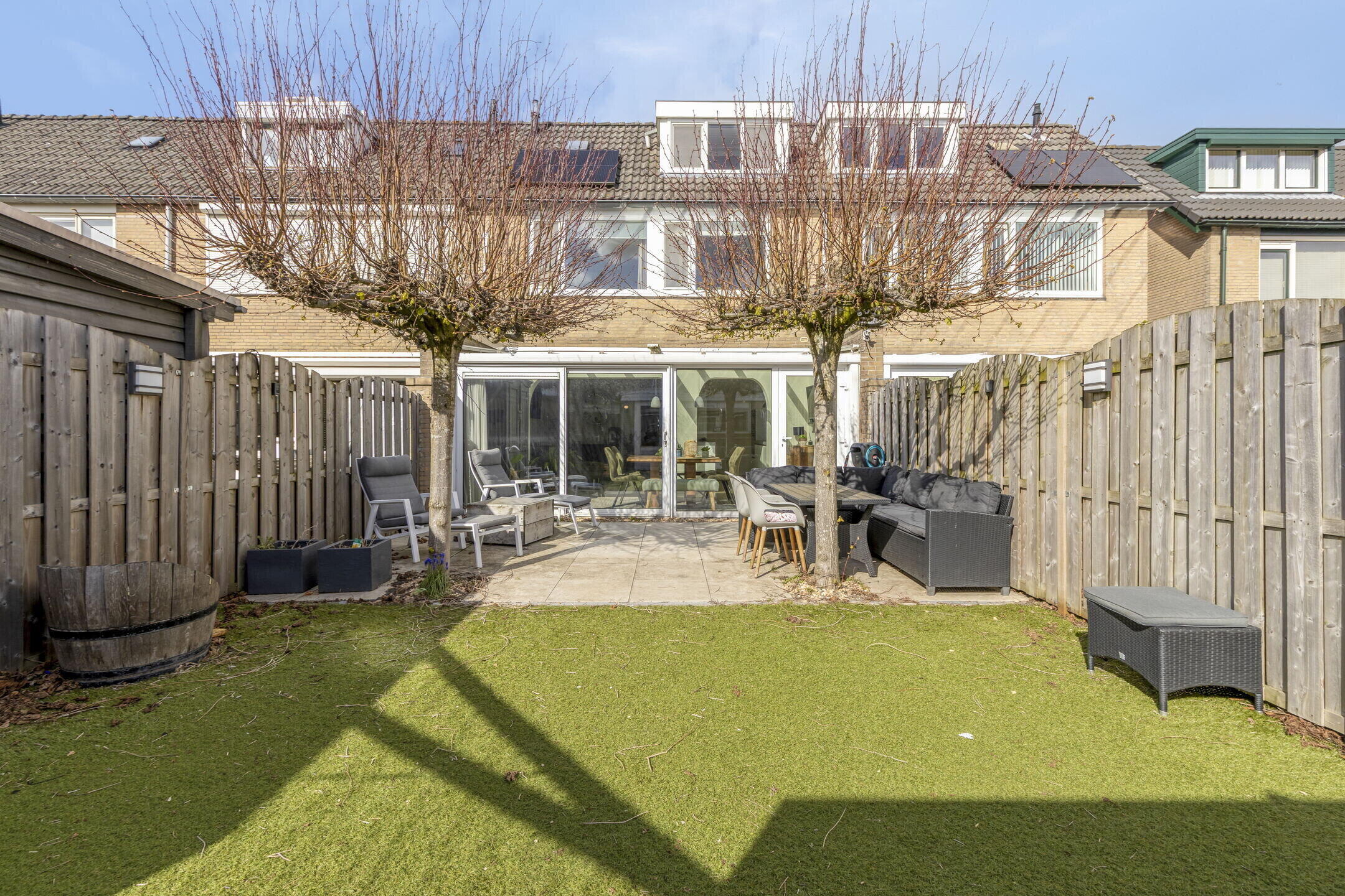 Vanuit de serre stap je zo de achtertuin in en wat een fijne plek is dit! De tuin is netjes aangelegd en biedt voldoende ruimte om te ontspannen. Achterin vind je een praktische schuur en een handige achterom. De twee grote platanen zorgen voor een prettige schaduwplek op warme dagen, waardoor je hier altijd comfortabel kunt genieten.