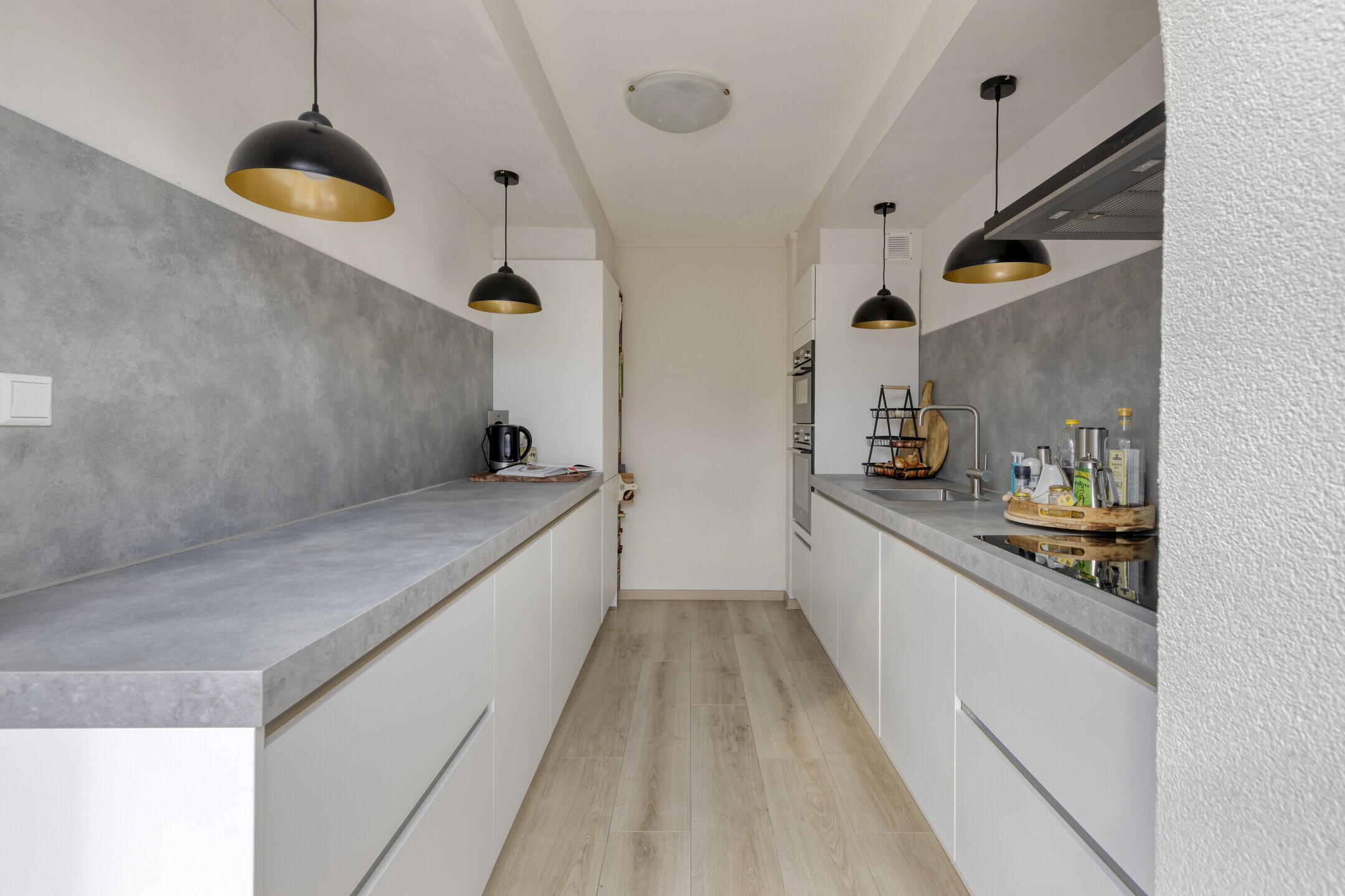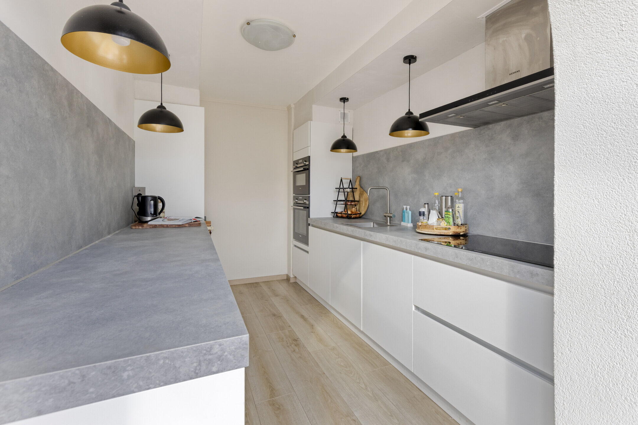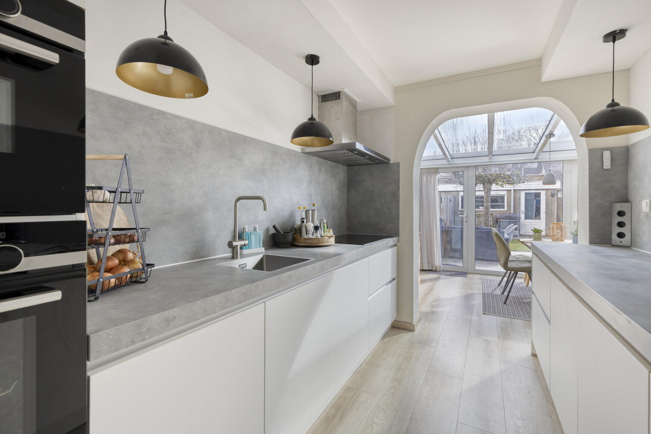 De keuken bereik je via de serre welke voor veel lichtinval zorgt. De serre is voorzie van een elektrisch scherm voor de zonnewering in de warme dagen (deze is recent vervangen). De woning beschikt over een moderne, strak afgewerkte witte keuken met volop werkruimte en alle benodigde inbouwapparatuur. Hier kun je direct aan de slag, de pannen kunnen zo uit de kast!