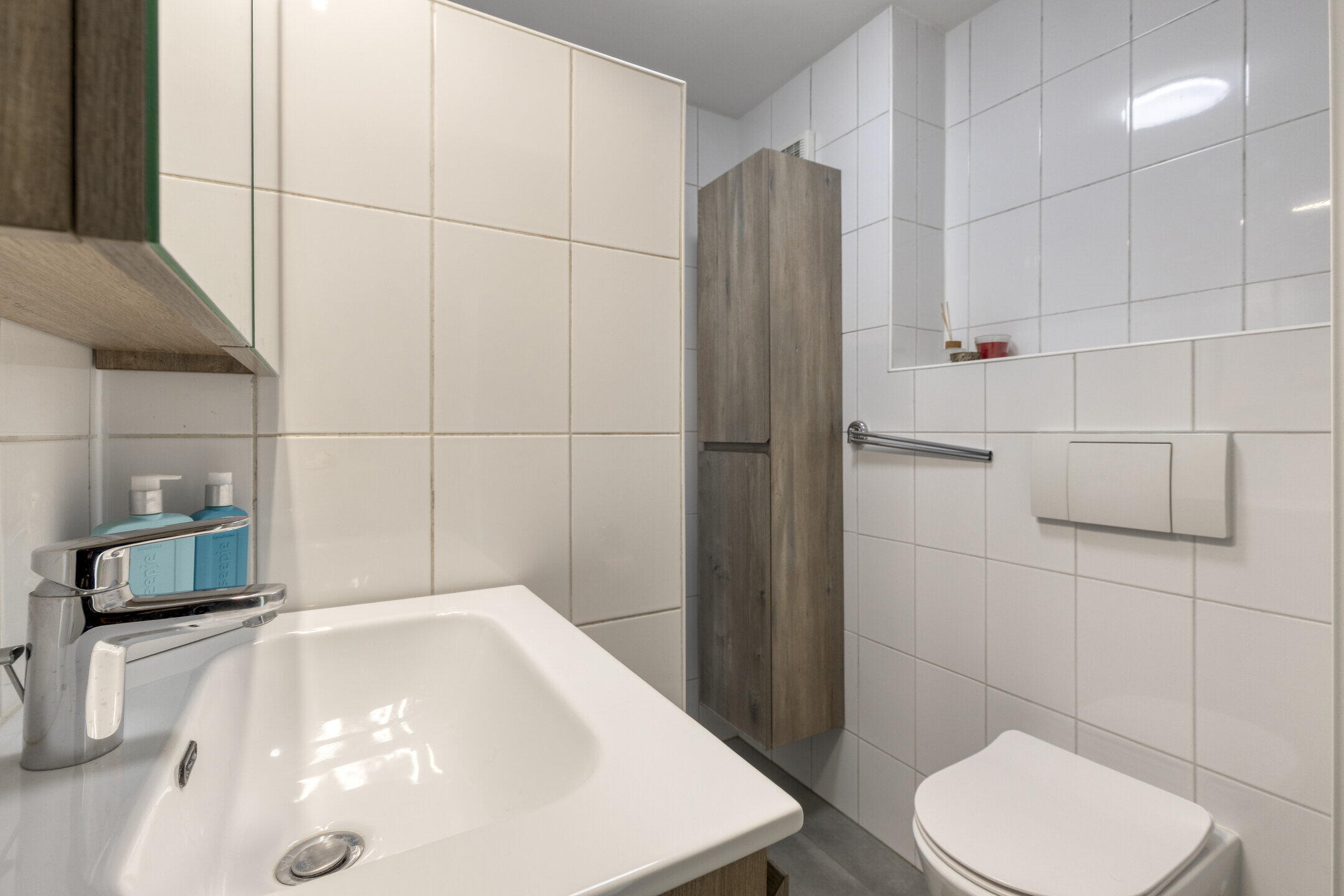 De badkamer is praktisch en tijdloos ingericht met een douche, toilet en wastafel met kastruimte. De combinatie van witte tegels en houten accenten zorgt voor een frisse, neutrale sfeer.