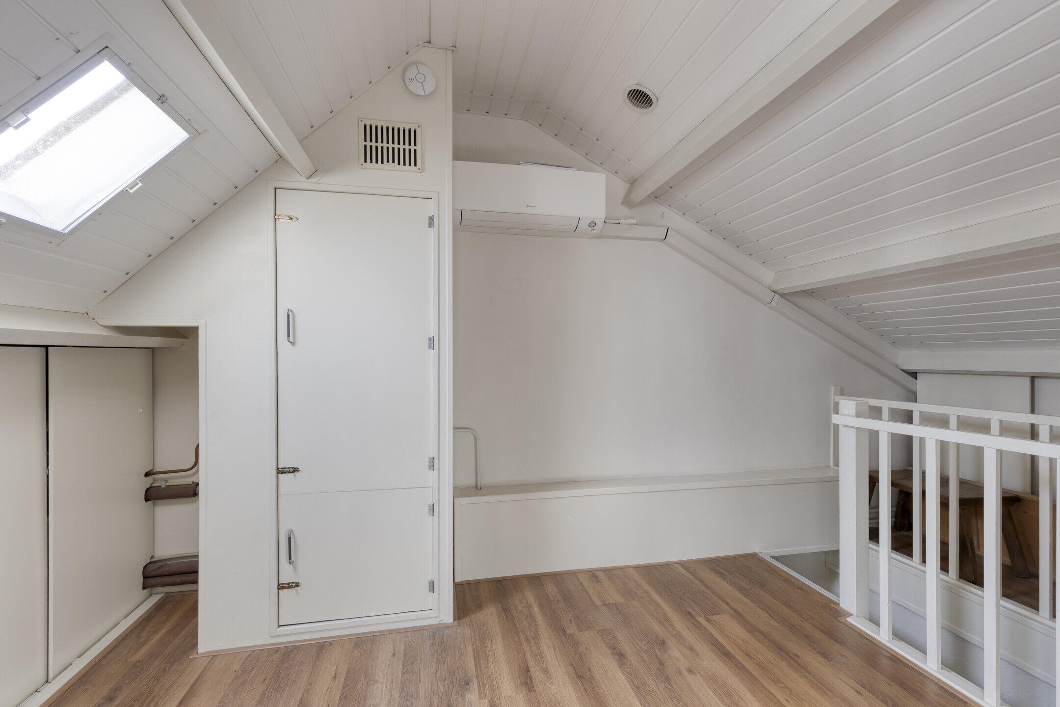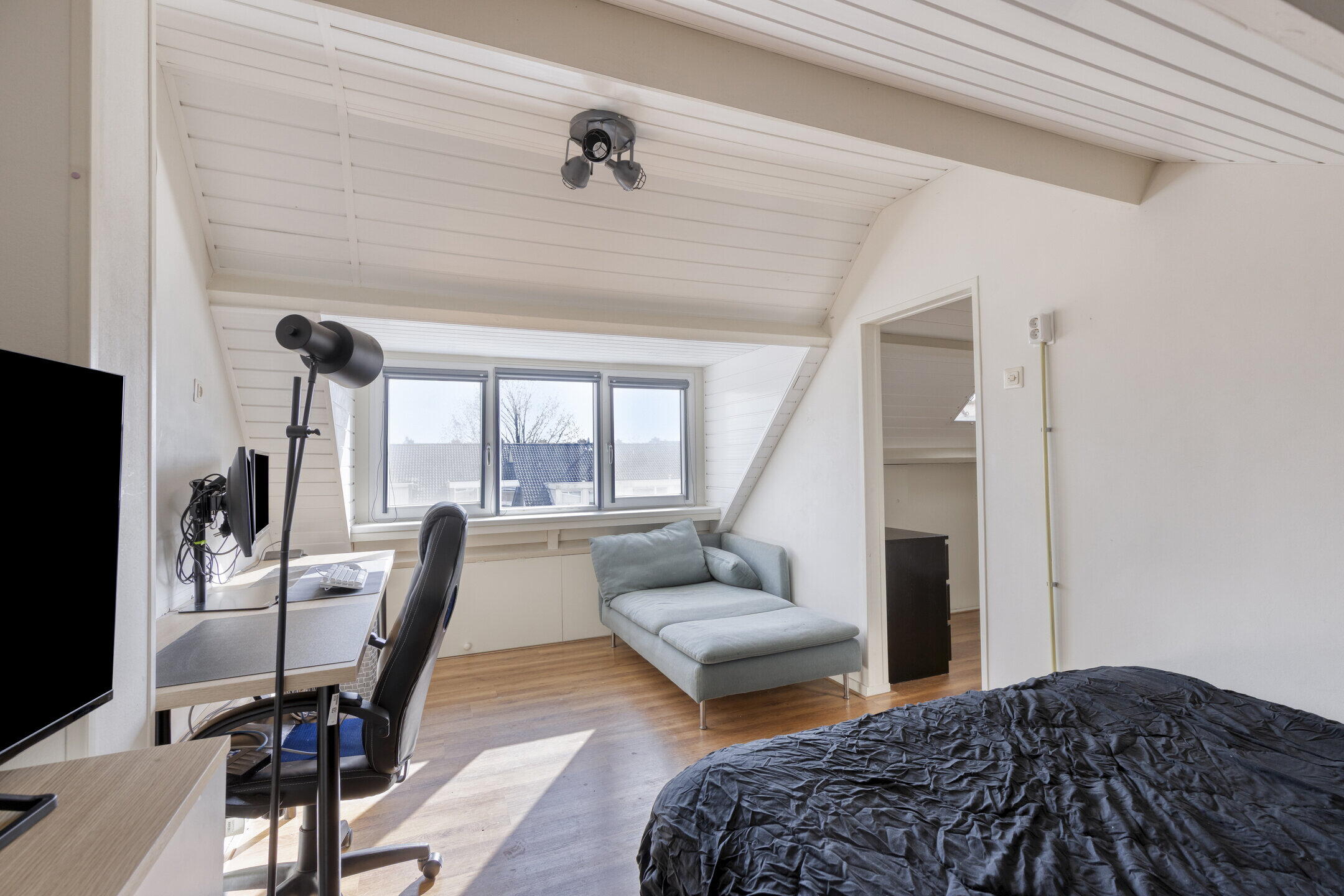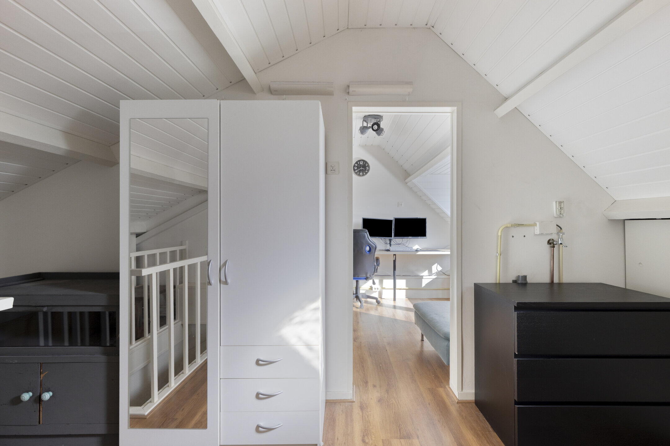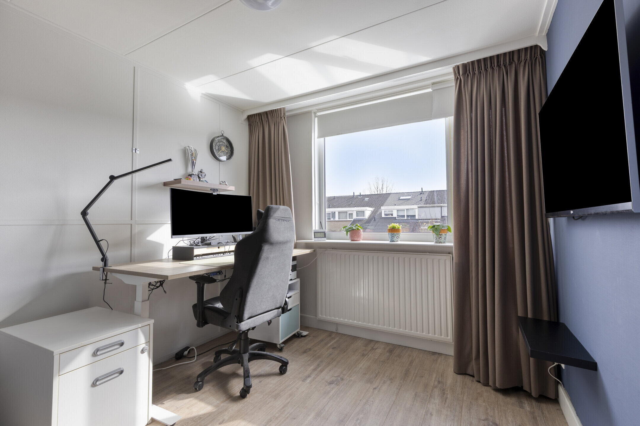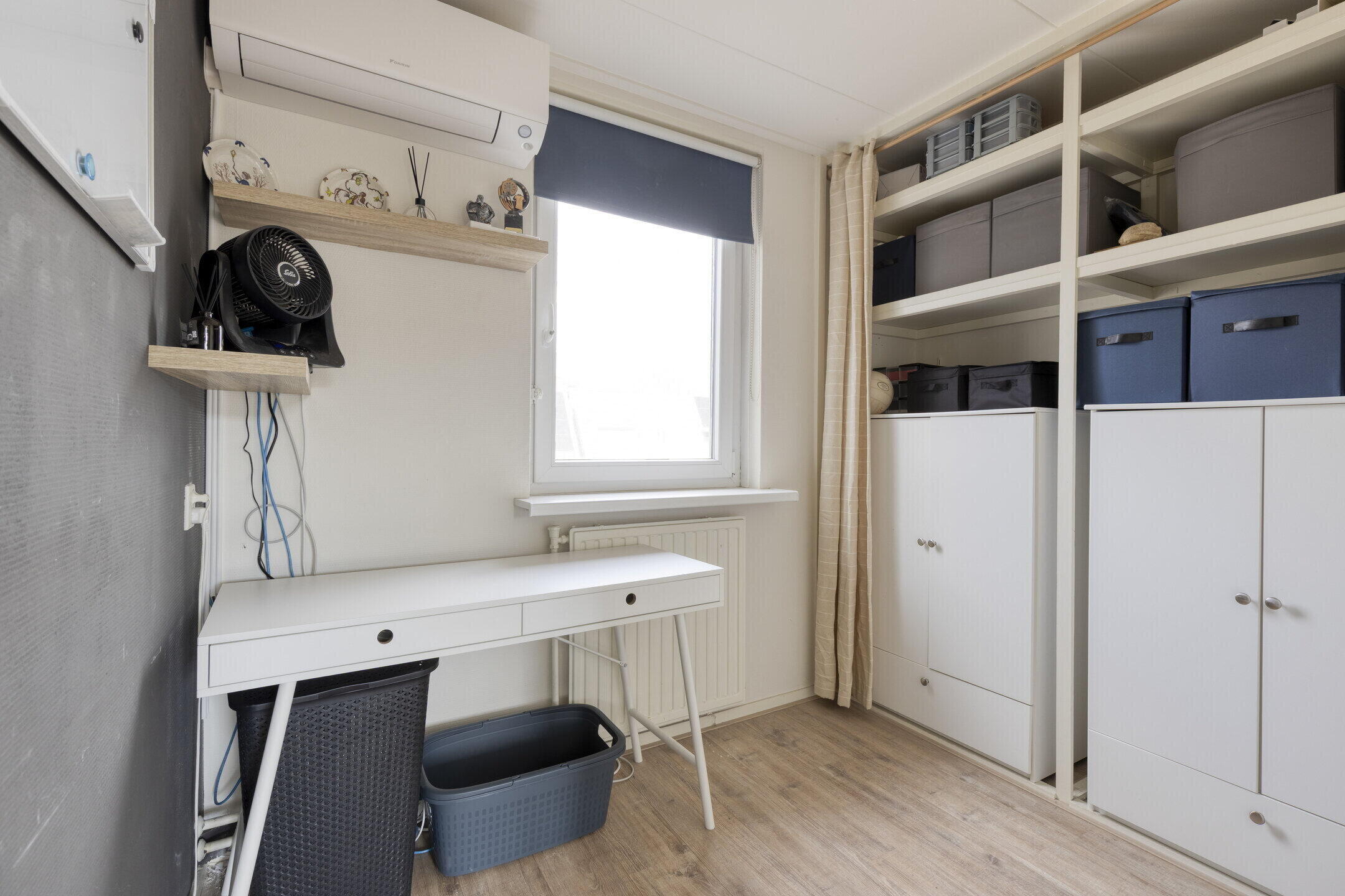 Op de eerste verdieping bevinden zich maar liefst vier kamers. Momenteel zijn twee kamers ingericht als werkruimte, maar ze zijn eenvoudig te gebruiken als slaapkamer. De nette afwerking en de doorlopende vloer zorgen voor een rustige en uniforme uitstraling.